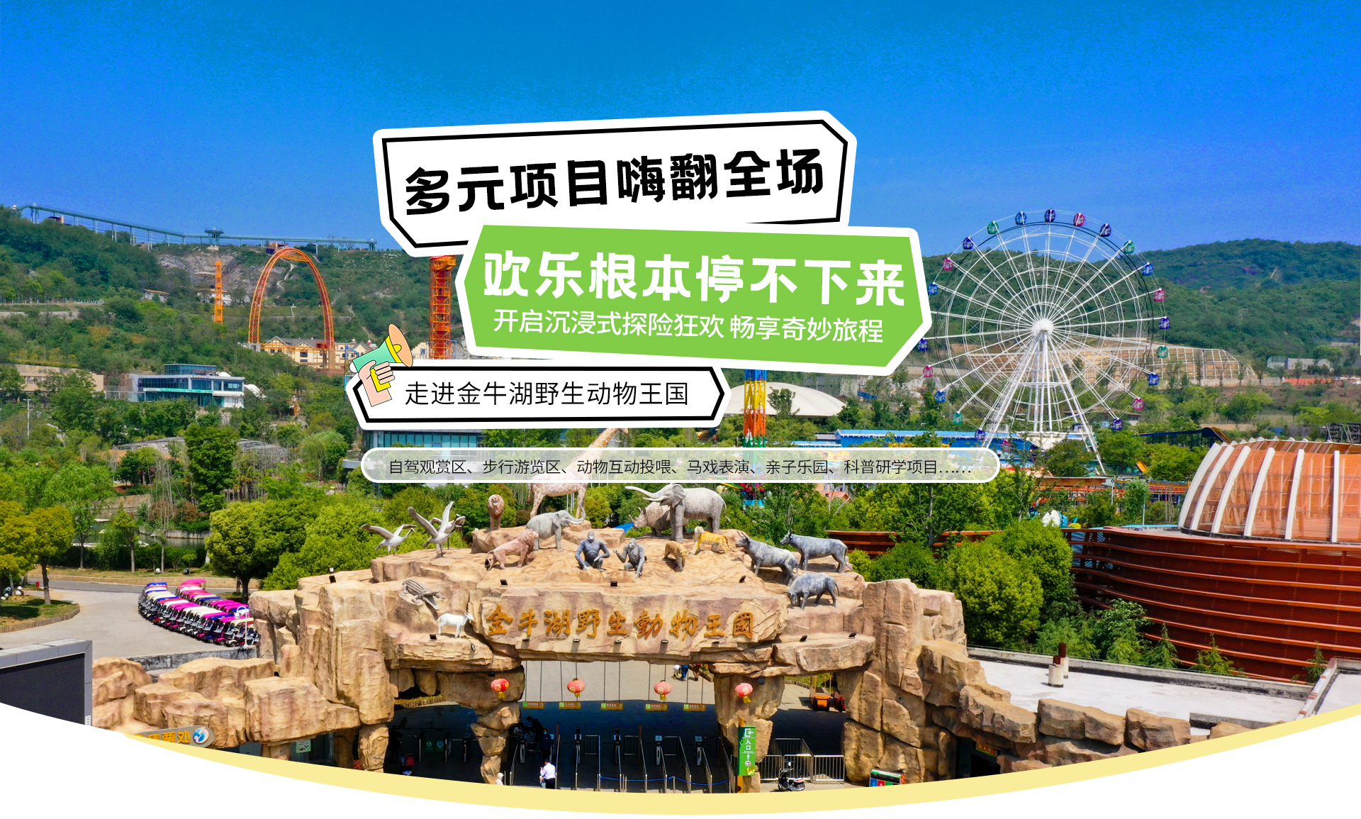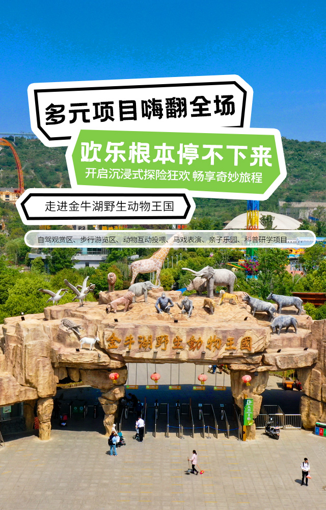 依托金牛湖旅游度假区,自然环境优越。园内动物种类丰富,创新推出“自驾+步行”双模式游玩,涵盖自驾观赏区、步行游览区、动物互动投喂、马戏表演、亲子乐园、科普研学项目等多个项目,深受广大游客喜爱。