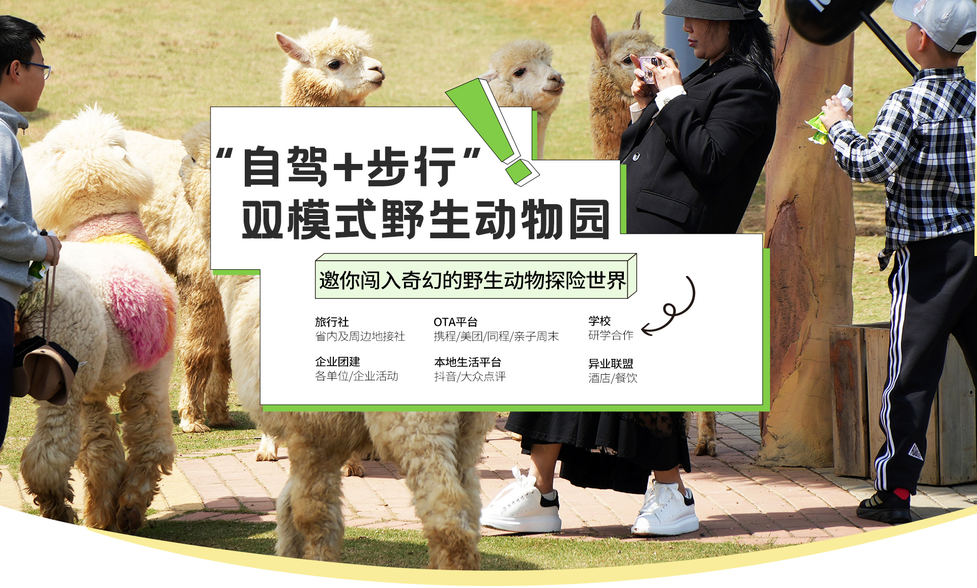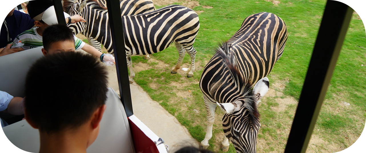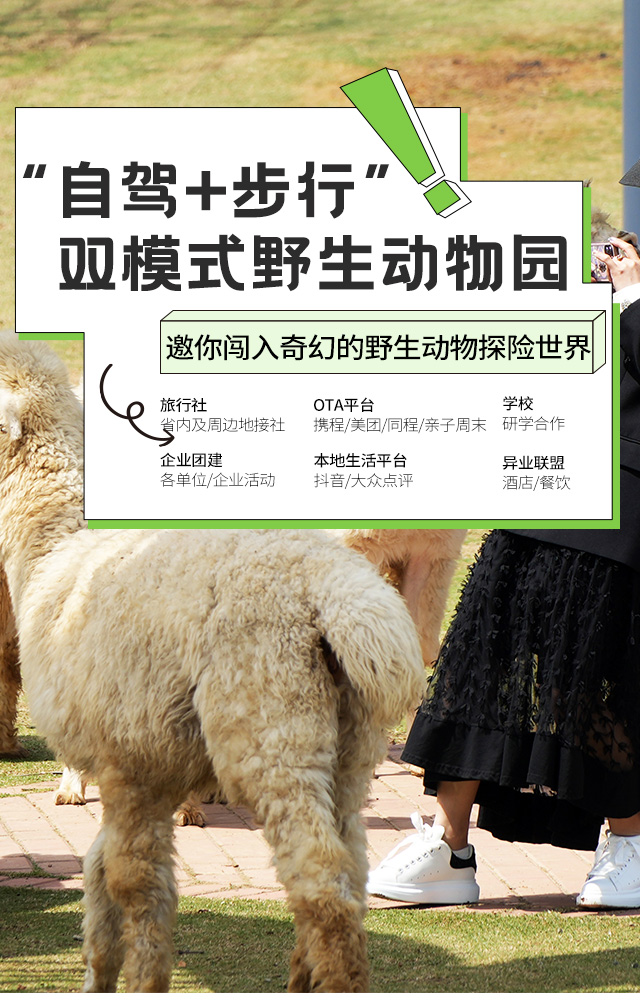自驾区可近距离接触散养动物,自由度高,互动性强,高空项目、网红动物IP等新奇玩法,适合年轻人拍照打卡发圈;全园区可参与动物逗喂,动物研学特色明显,适合全家全天游玩及科普互动。